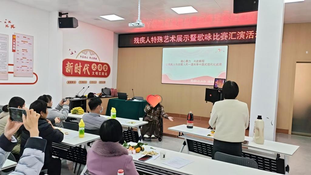 在特殊艺术展示暨歌咏比赛环节,现场气氛温馨而热烈。残疾人朋友们自信登台,一展歌喉,用真挚的歌声抒发对美好生活的向往与热爱。他们的精彩表演,不仅展现了昂扬向上的精神风貌,更赢得了台下观众的阵阵掌声与共鸣。这一方小小的舞台,成为了传递情感、绽放光彩的温暖空间,让大家在艺术的交融中,深深感受到了社区的凝聚力与人文关怀。活动尾声,社区还为每一位参与者准备了暖心纪念礼品,用镜头定格下这些温馨动人的瞬间。